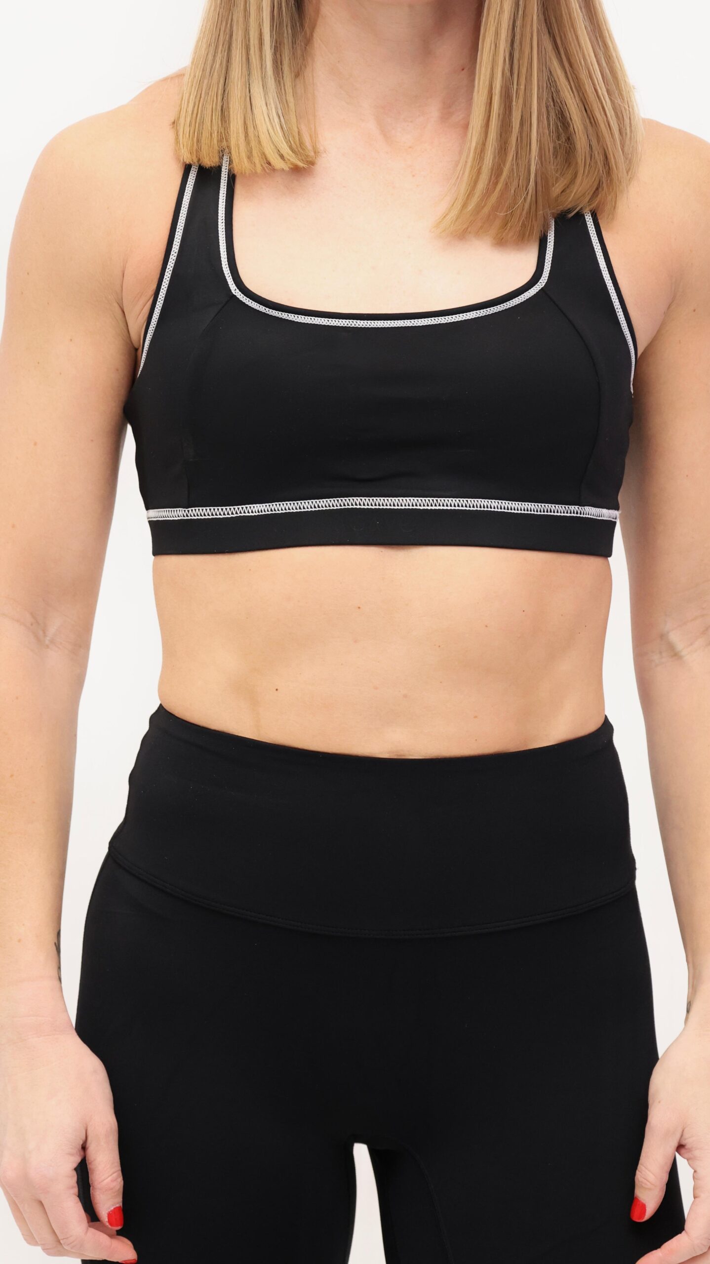 Crafted in a luxe 78% nylon / 22% spandex blend, this top delivers a second-skin feel with sculpting support. The sleek contrast trim enhances the neckline and underband, elevating its silhouette with subtle definition. Soft compression smooths and supports without restricting movement.